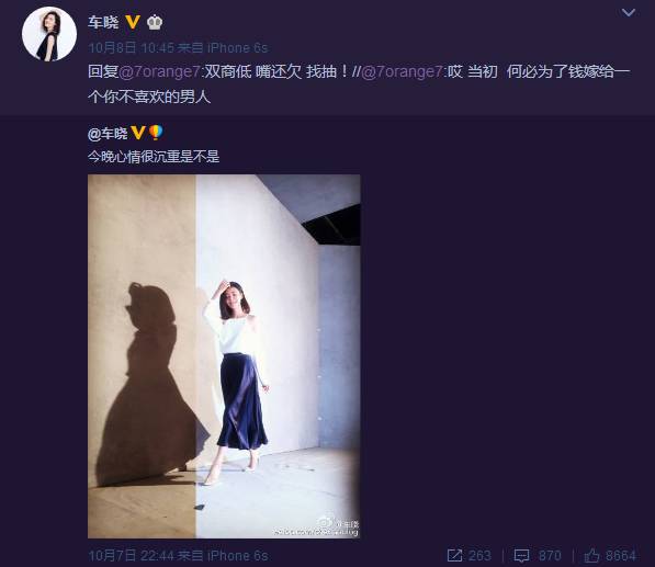 知性女星车晓此前闪嫁山西首富李兆会,两年后又突然离婚,很多人猜测她是豪门梦碎,然而猜测归猜测,跑人家微博发感慨,也难怪被车晓直接挂了出来:“双商低,嘴还欠,找抽。”