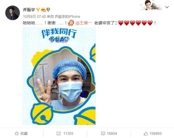 10月8号,乔振宇也发微博报喜,妻子王倩一生下二胎女儿。