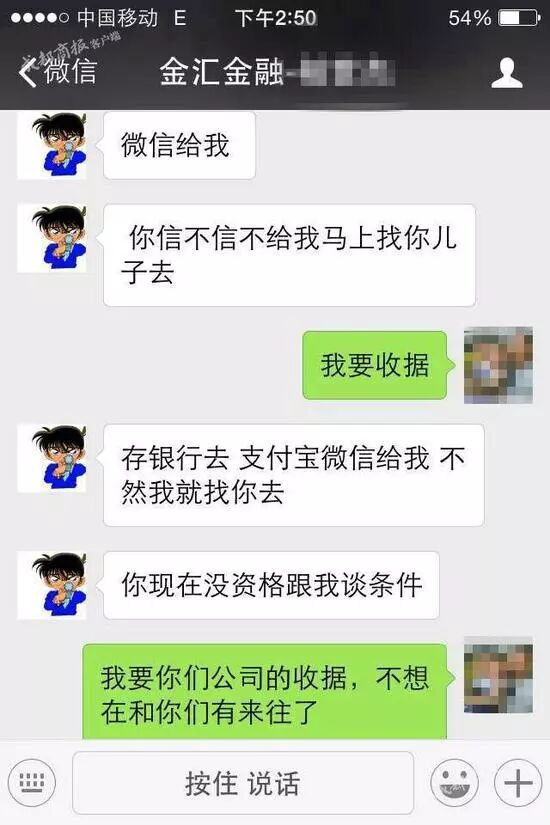 李某及叶某弟弟等人提供的电话录音、微信聊天记录等显示,家人以叶某的名义和“金汇金融”公司催收人员联系时,希望对方提供借条、合同等正规网贷借款凭证时,对方却表示需要先通过支付宝或微信还款后方可提供,还称之前贷款的4000元可还3万元一次性解决。由于无法提供借款凭证,叶某的丈夫等拒绝还款,对方竟称要去找叶某儿子,还发信息说:“孩子那么可爱,不想他出什么事吧。”对方还称,知道叶某住在哪里,儿子在哪个幼儿园,何时放学等,并称将去把叶某儿子藏起来,到时30万元都解决不了。