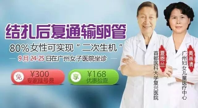 为了让因结扎而无法完成“二胎梦”的家庭,广州女子医院要在9月24~25日这两天“做大茶饭”,特意邀请了首都医科大学复兴医院妇产科夏恩兰教授、广州市妇女儿童医疗中心生殖内分泌专科主任黄燕清坐诊~~