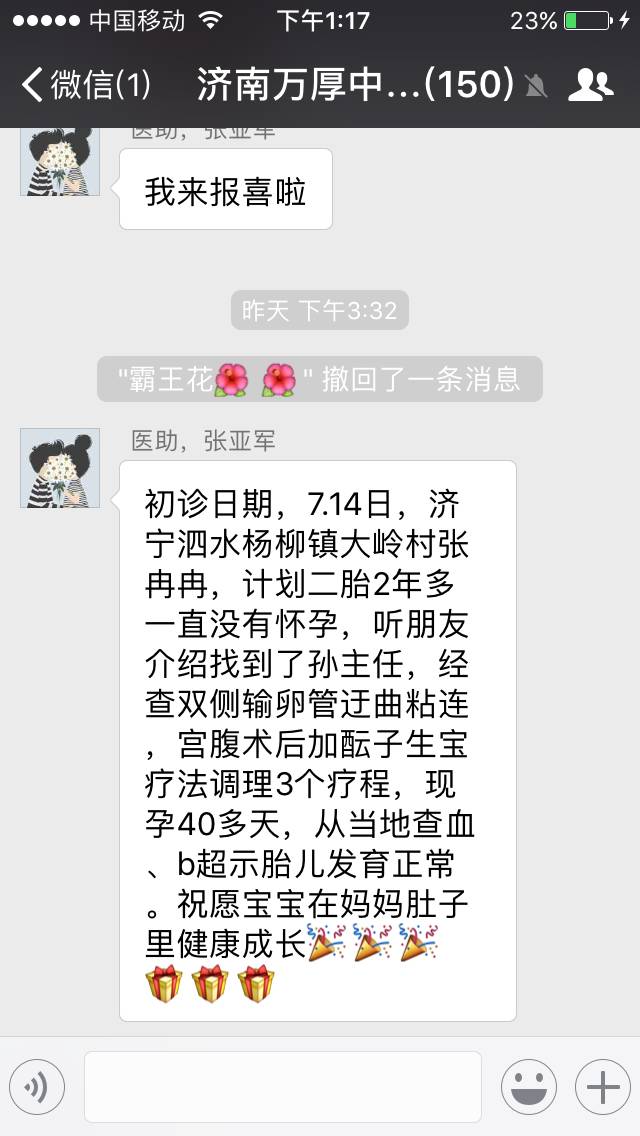张冉冉,济宁泗水杨柳镇人,育有一女,计划二胎却不得而终。在多家医院辗转治疗也没有取得良好效果。最终于2016年7月14日来万厚不孕不育医院接受治疗,昨天前来报喜。