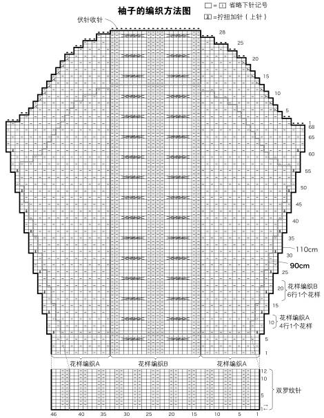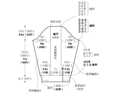 2. 用一般起针法,再用双罗纹针、花样A、B编织袖子。