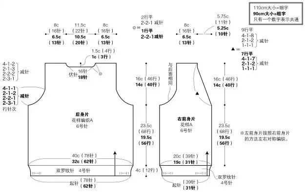 1. 用一般起针法,再用双罗纹针、花样A编织前后身片。