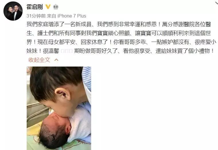 今日中午,霍启刚在微博宣布郭晶晶二胎生下一女,还晒出儿子亲吻小女儿的照片,画面超级有爱⬇️