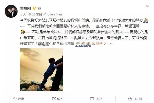 然后,铁证如山,“准爸爸”霍启刚终于在微博上承认,因为平时都比较少回应关于私人的事情,所以一直没有公布喜讯,更是晒出了大儿子霍中曦亲吻妈妈肚子的温情照片⬇️