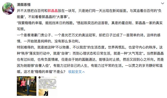 借网友的一句话,一个是香港豪门贵公子,一个是光芒万丈的奥运冠军,却把日子过成了一首简单的诗,这样的感情,一开始是纯粹的,没有那么多功利,所以后来才有了稳稳的可能。