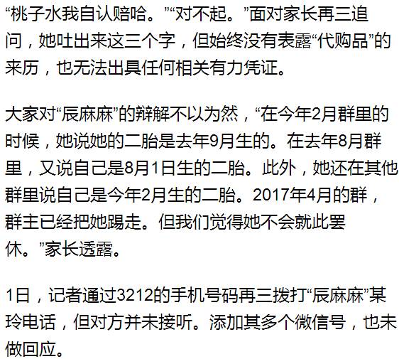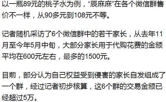 找“辰麻麻”代购的人不止一人,阿蛮告诉记者,备孕群中100多号人大部分都委托其代购了各类产品,多的2000元左右,少的100多元。