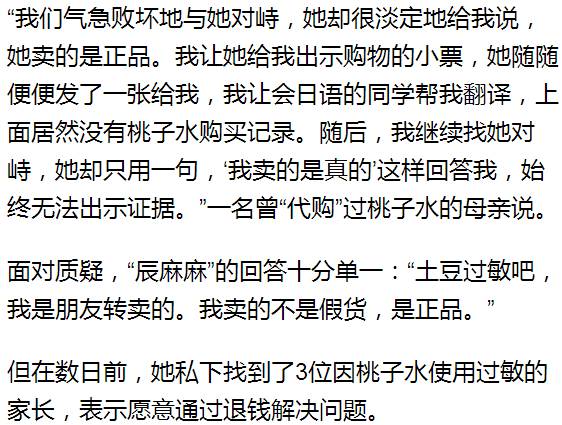 一些家长反映,从“辰麻麻”处买的桃子水,用后宝宝曾出现过敏的症状。“快递单发现以前,我们就曾互相问,从辰麻麻那买了桃子水的妈妈们,有没有发现宝宝过敏的情况?一聊发现,几个宝宝们都出现了过敏的情况。”网友“艾思”说,她之前只是以为自己孩子体质特殊不适用罢了。