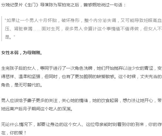 这些都不是一个笑话,而是告诫着每一个做丈夫的男人,那个愿意替你生儿育女的妻子有多伟大,她承受了多大的痛苦,也应当承接更大的幸福,而这一切,都应该由丈夫去自觉。