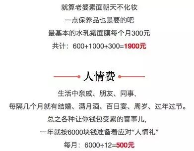 每月不固定开销费用汇总:保姆费2800+娱乐费500+买买买1900+人情费500+医疗费340=6040元