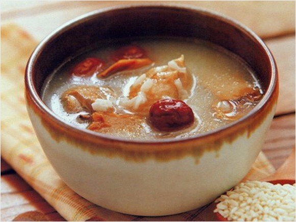 将鸡腿块放入米汤中,再加入药材及米酒以小火炖煮1小时即可。