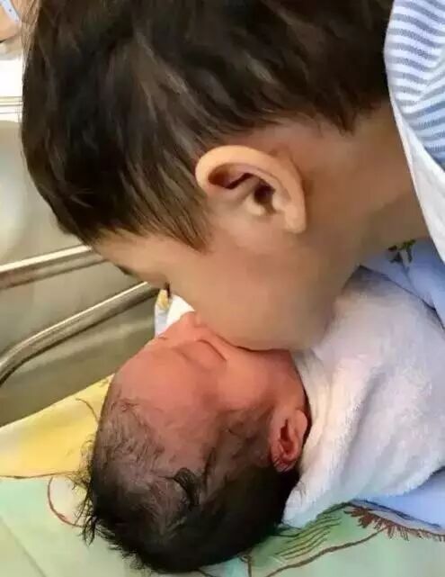 霍启刚还配上了儿子亲吻新生妹妹的照片,很是温馨有爱。