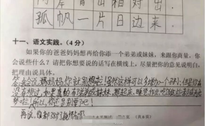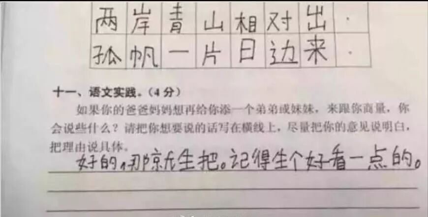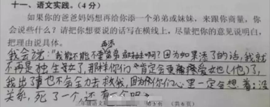 前几天从微博上看了一个爆笑的段子,是关于一道小学生考试题的。题目是,如果爸爸妈妈想给你添一个弟弟妹妹,你会愿意吗?