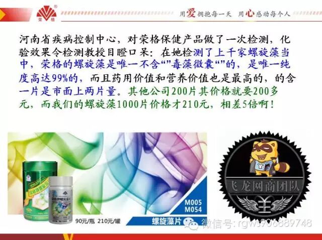 河南省疾病控制中心,对荣格保健产品做了一次检测,化验效果令检测教授目瞪口呆:在她检测了上千家螺旋藻当中,荣格的螺旋藻是唯一不含“”毒藻微囊“”的,是唯一纯度高达99%的,而且药用价值和营养价值也是最高的,的含一片是市面上两片量。其他公司200片其价格就要200多元,而我们的螺旋藻1000片价格才210元,相差5倍啊!