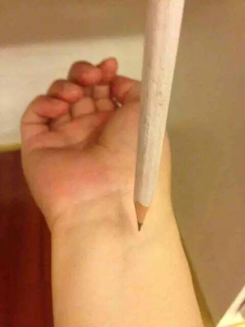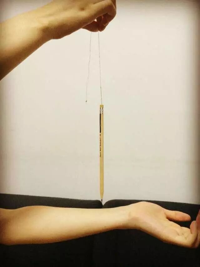 3、叫同伴帮忙拎起针头上的线把整支铅笔垂直地吊在自己的右手动脉的正上方,不能离动脉太远,大约保持3-5毫米左右的距离;