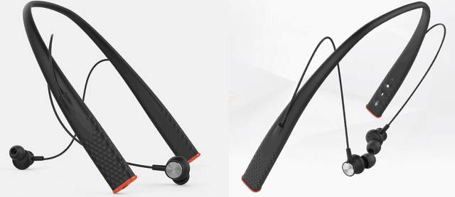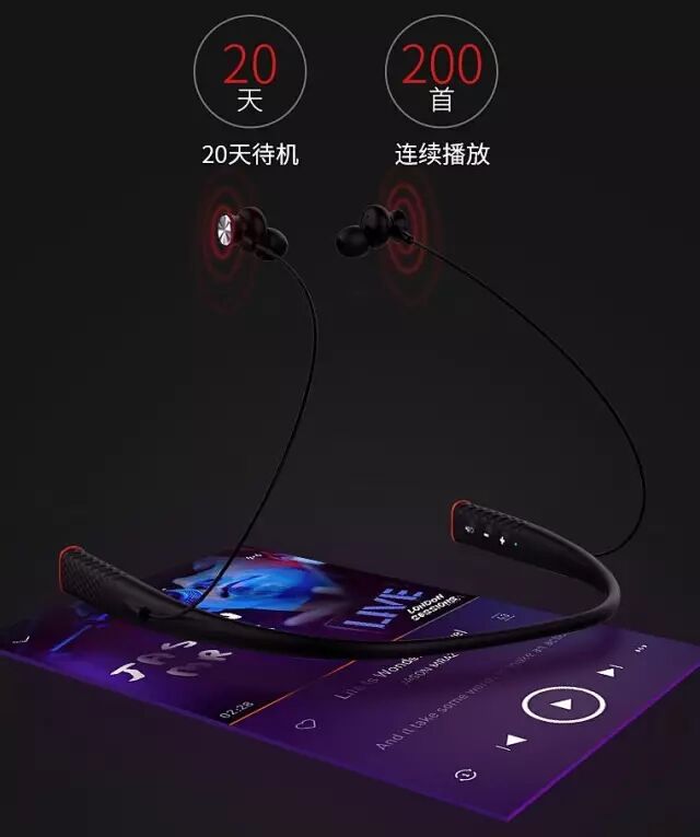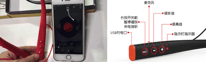 在颈圈上还有着内置降噪回音消除技术的麦克风、USB充电口,与音量控制(加、减号按一下为音量调节,长按为上一首或下一首歌曲切换模式)、来电接听(长按开关机、暂停波峰)多功能按键的设计。。。