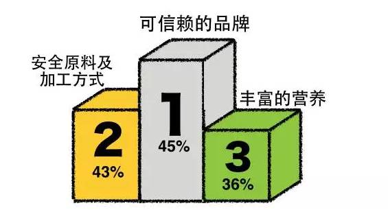 超过三分之一的中国受访者表示当他们选择某一婴儿食品时,丰富的营养(36%)、安全的原料及加工方式(43%)是十分重要的考虑因素,分别排在重要性的第二和第三位。而可信赖的品牌以45%的得票率排在所有考虑因素的第一位。有机或纯天然食品同样是一个十分重要的考虑因素,尤其在亚太地区,31%的受访者选择了这一选项。相比于非洲或中东、拉丁美洲和北美地区,分别仅有26%、20%和18%的受访者表示有机食品是其在决定购买婴儿食品时的一个重要考虑因素。