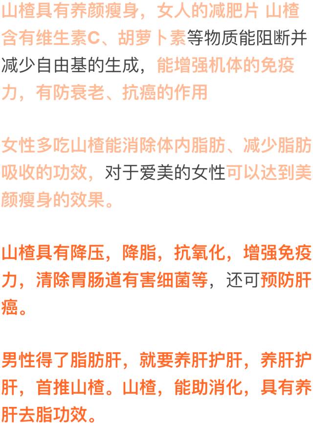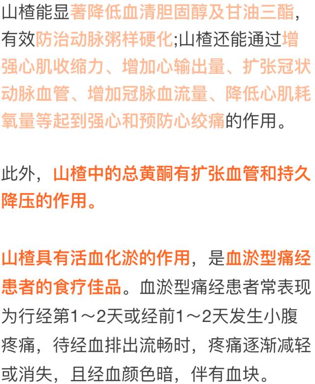山楂含糖,蛋白质,脂肪,维生素,胡萝卜素,淀粉,苹果酸,钙,铁等物质,山楂浑身是宝。具有降血脂,降血压,强心和抗心律不齐等作用。