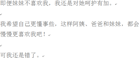 阿姨和爸爸又是唱歌又是讲故事,哄了整整一夜,才把妹妹哄好。他们没有骂我,也没有安慰我,只让我快去睡觉。
