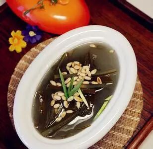 2、锅置火上,放入鸡汤、松子仁、海带丝用文火煨熟,加盐调味即成。
