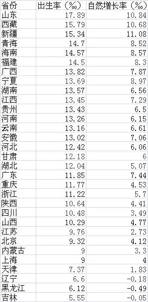 2016年各省份人口出生率和自然增长率