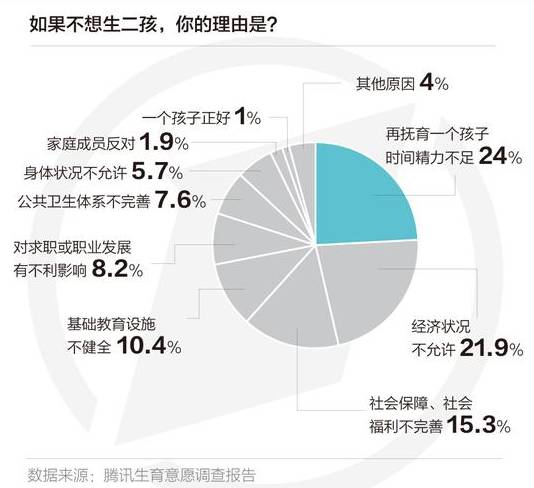根据上述调查统计分析得出的“中国人‘二孩’生育意愿调查报告”,再抚育一个孩子时间精力不足(24%)、经济状况不允许(21.9%),是国人不敢生二孩的主因。而男性多因经济原因不生二孩,女性更多考虑时间精力因素。此外,社会保障、社会福利不完善(15.3%),基础教育设施不健全(10.4%),公共卫生体系不完善(7.6%),身体状况不允许(5.7%),家庭成员反对(1.9%),对求职或职业发展有不利影响(8.2%),一个孩子正好(1%)以及其他原因(4%),都会影响二孩生育意愿。