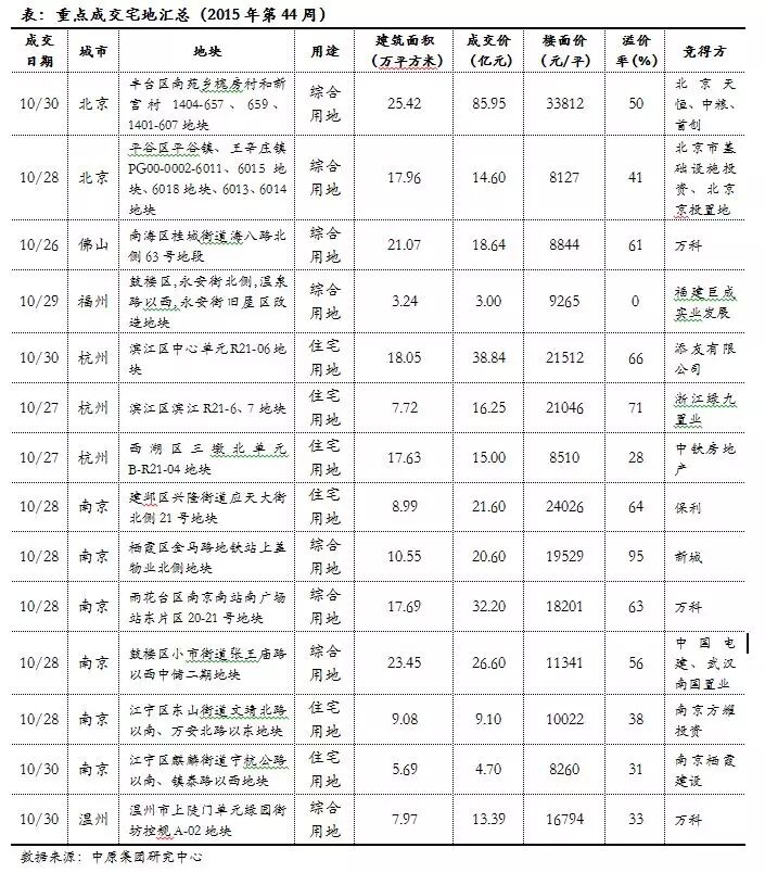◇ 南京宅地成交火爆:上周,南京宅地市场成交火爆,区域地王频现。最终,南京上周出让9宗含住用地,成交总价128.22亿元,其中4宗地块溢价率超过50%。保利竞得的建邺区兴隆街道地块楼面价达到24026元/平方米,成为南京历史单价地王,且其它多宗成交宅地均刷新区域楼面价纪录。南京今年下半年以来住宅成交持续火热,且房价涨幅明显,后市预期较好,引各大房企竞相抢地。9月南京新房价格指数同比涨幅仅次于四大一线城市,排名全国第五。