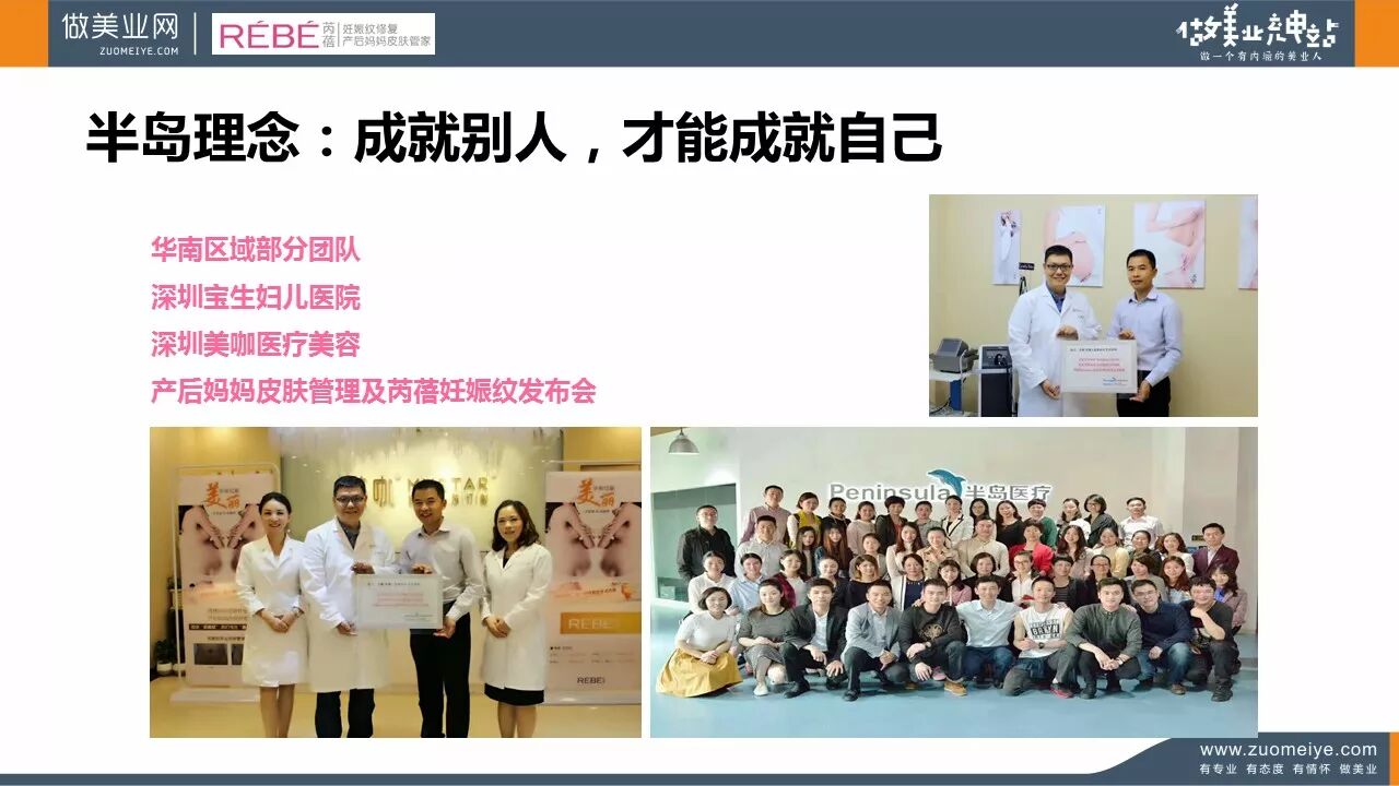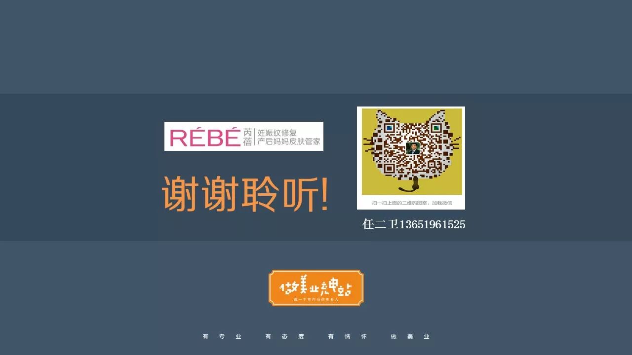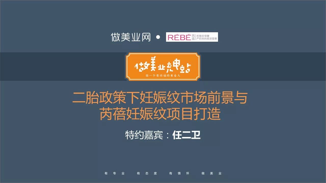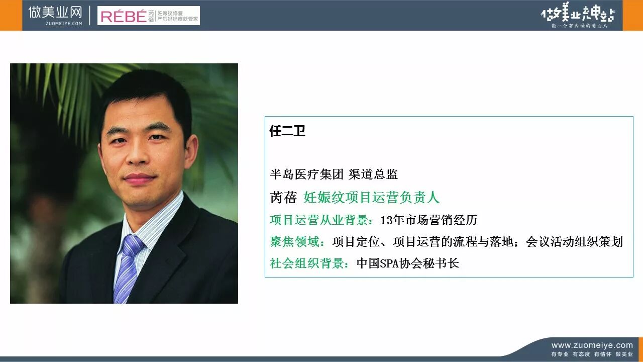 做美业充电站,做一个有内涵的美业人!各位美业的朋友们,大家新年好,首先感谢做美业平台,有机会和大家分享解读,二胎政策下妊娠纹市场的前景与芮蓓妊娠纹项目打造。我叫任二卫是半岛医疗集团渠道总监,在做美业13年以来一直从事营销和渠道工作,目前在半岛集团负责芮蓓项目的推广,同时还兼任中国spa协会秘书长,今天很开心能够与大家一起来分享我们芮蓓妊娠纹项目。