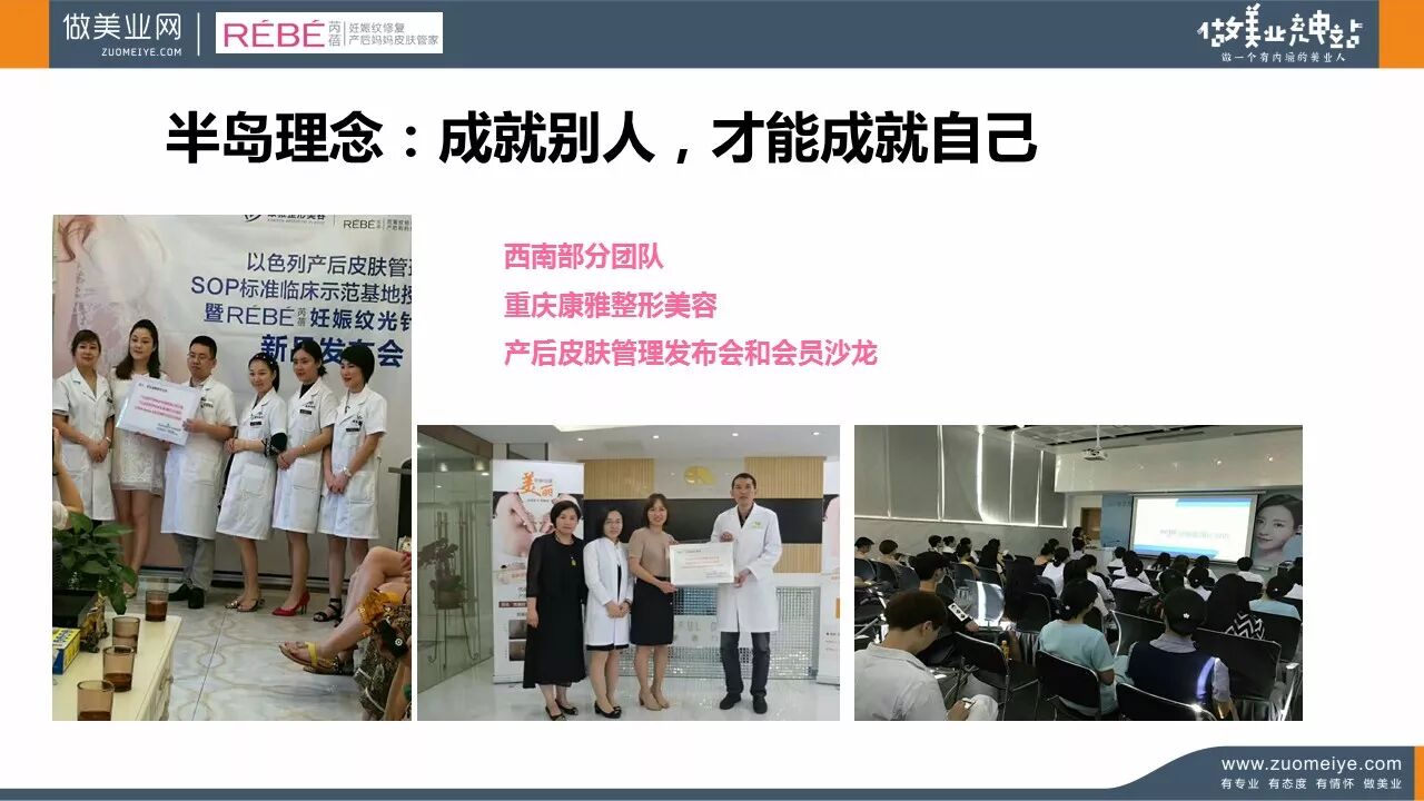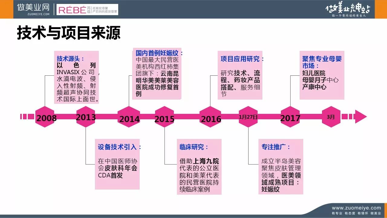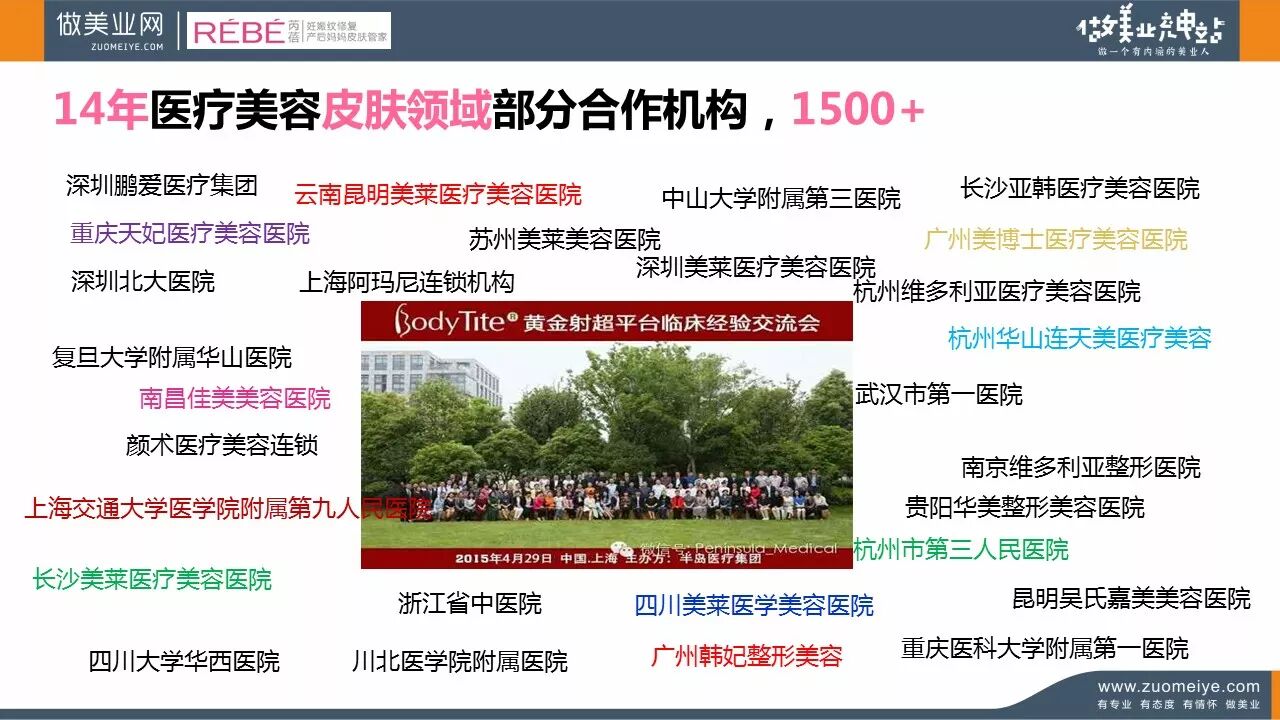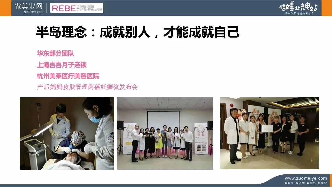 那正是因为李大铁教授做妊娠纹项目效果非常好,所以我们接下来在2015年的时候,我们就以上海九院为代表的公立医院和美莱为代表的民营机构,来做妊娠纹项目的临床研究,做了大量临床,累计数据近千例。同时我们不光是技术研究还包括整个服务流程、药妆产品搭配,以及整个服务流程SOP细节等等,做到了芮蓓妊娠纹项目疗程化,同时我们也成立半岛美容,专门推广芮蓓妊娠纹项目,将医美项目推广到我们美容行业。