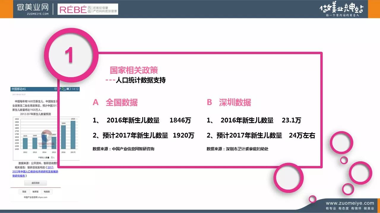 目前我们国家是鼓励生孩子的。2014年1月份的时候我们国家单独二胎政策开放。到2015年12月份,因人们生孩子意愿不强,再一个国家大的方向是鼓励生二胎,所以在2015年12月份,国家出台政策全面开放二胎,2015年的时候增长不明显,因为在二胎政策开放前,我们国家的新生儿出生率了每年大概是在1500万左右,从左边的柱状图可以看出来,左边的数据在2016年的时候,我们全国新生儿数量是1846万,这是什么概念呢?如果每位产妇,他有3000元做一个产后修复,坐月子,婴幼儿市场,那我们的产后总金额是600亿人民币,那我们的数据预计17年新生儿的数量将突破1900万,达到1920万,所以我们从数据背后可以看到,整个产后修复市场金矿所在。