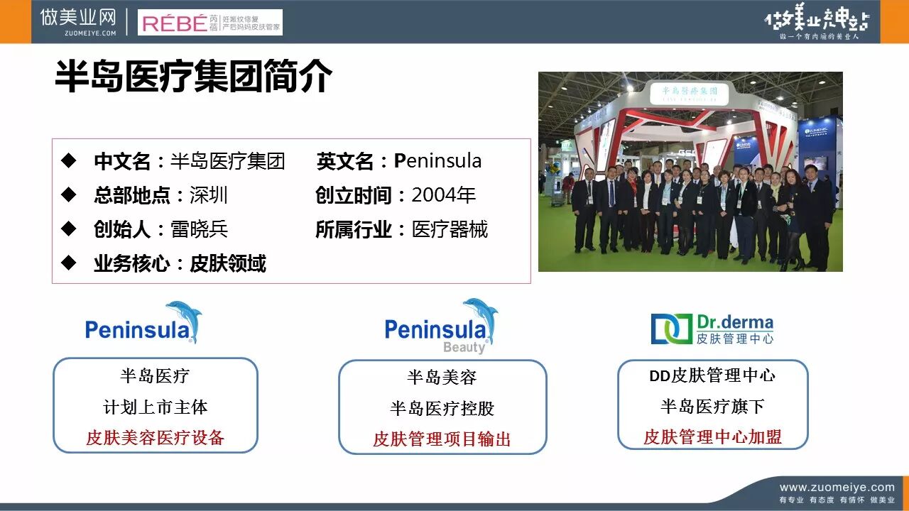 半岛医疗集团聚焦于皮肤科领域。公司上市的主体是半岛医疗集团,我们计划2019年在深圳上中小板。目前半岛美容主要是做皮肤管理项目输出,以及皮肤管理整店输出。我们也成立了国内首个以皮肤管理为主题的社群——DD皮肤俱乐部。很多行业朋友也都是我们DD皮肤俱乐部的会员或者参与我们DD俱乐部举办一系列活动。