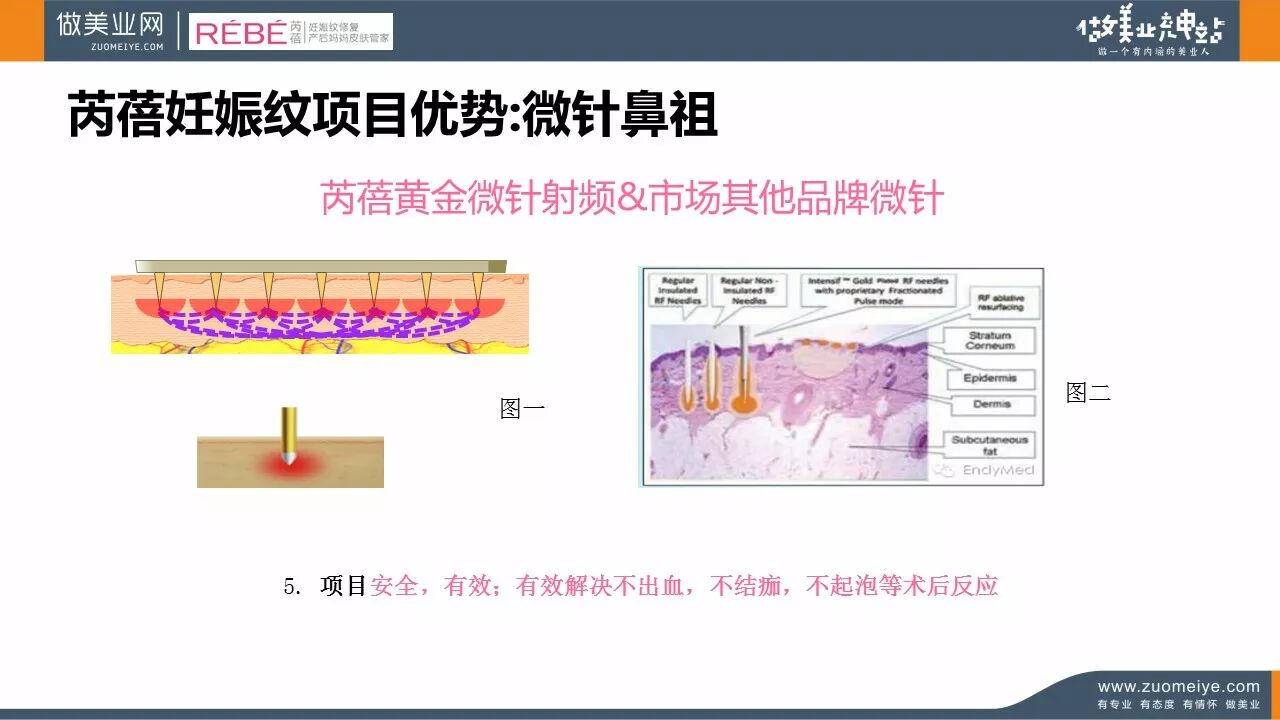 所以我们的芮蓓妊娠纹项目更加的安全,有效。解决了传统的微针所不能解决的比如说操作时出血或者结痂或者起泡,那我们很好地解决了以上问题。所以不仅操作舒适度有改善,同时术后修复的时间和整个安全性能都更有保证。术后创伤小,复诊率小,不光解决妊娠纹同时对腹部皮肤嫩肤和紧肤效果更好。