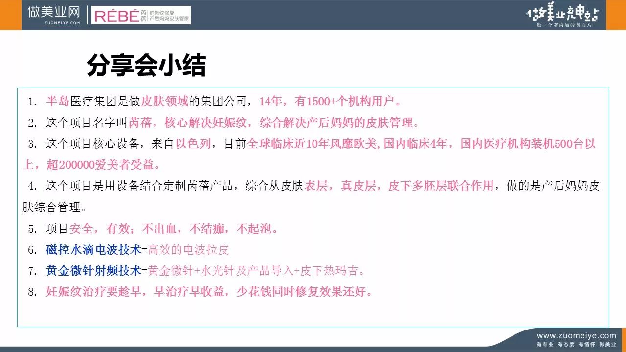 今天很感谢我们做美业网平台,提供这样的机会来跟大家分享我们半岛医疗集团的芮蓓妊娠纹项目,这个项目名字叫芮蓓项目,核心的就是解决产后妈妈妊娠纹,综合解决产后妈妈的皮肤管理,我们这个项目是安全有效的,同时也不出血,不结痂不起泡。妊娠纹修护项目是要及早治疗的,早治疗早受益,不光花钱少同时修复效果更好。
