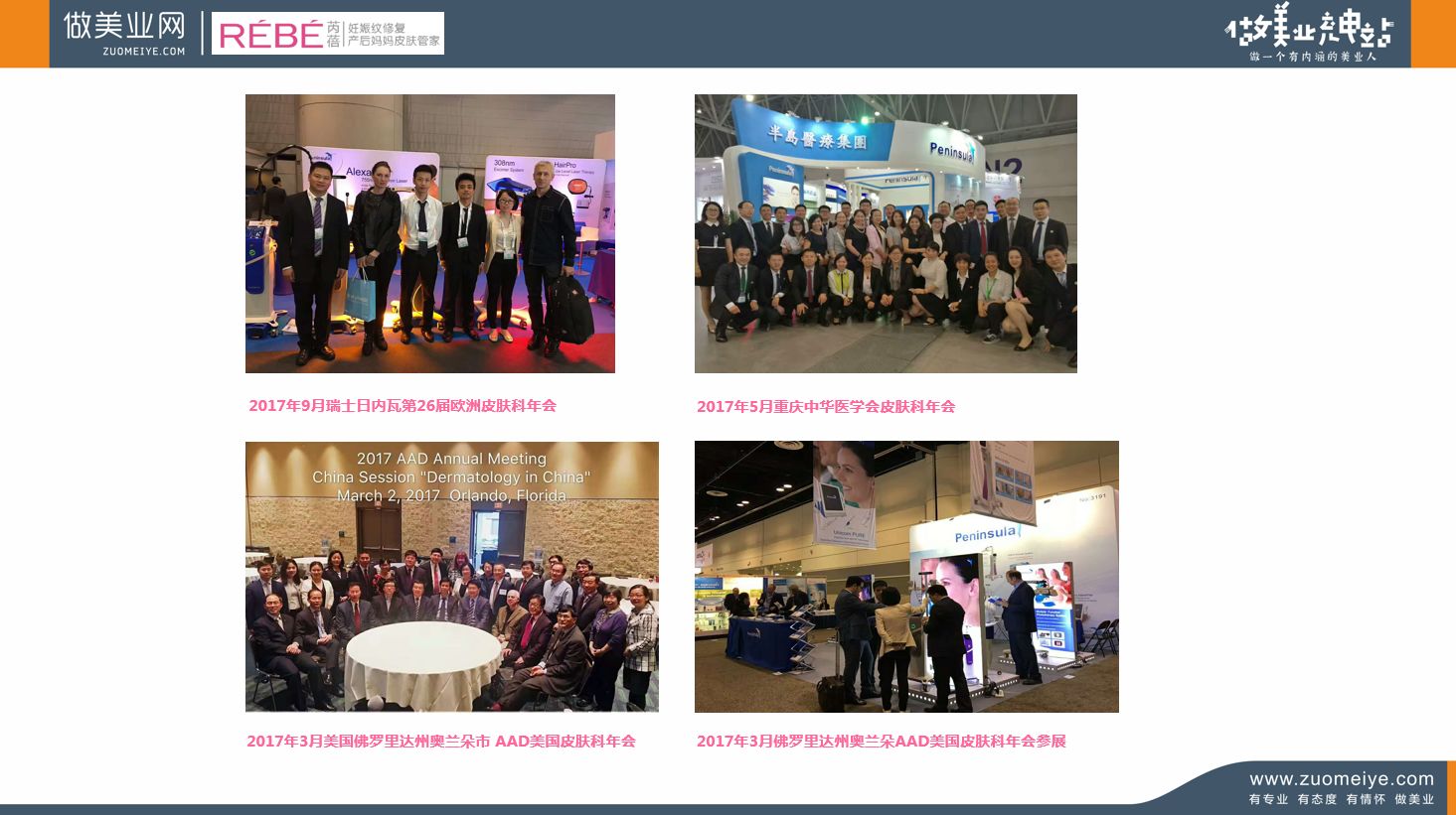 同时半岛医疗集团也是国家高新技术企业,在2016年的时候获得中国整形美容协会特别荣誉奖。我们定位是提供最佳皮肤管理解决方案。下面我们看一些半岛医疗集团参加中国和欧洲美洲的皮肤科年会,这些图片分别是今年9月份参加瑞士日内瓦第26届欧洲皮肤科年会的现场图片。我们公司生产的仪器和产品远销全球50多个国家和地区。这个今年5月份在重庆举办的中华医学会皮肤科年会,3月份在佛罗达州奥兰朵AAD美国皮肤科年会参展,当然这也是中国首次组团参展。