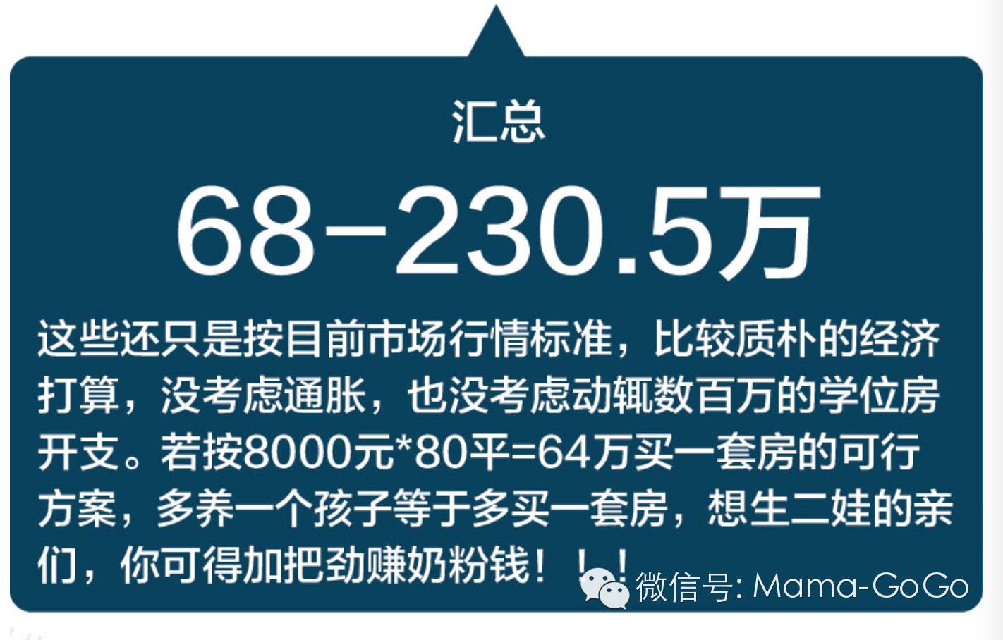 身在帝都的Go姐知道很多朋友看了上面的账单正在冷笑,别的不说,花王尿不湿180一包(个别超市卖220),基本上我看同事都是10包10包囤,奶粉进口超市380一桶,一桶就够喝10天。更别说学区房了,现在7环外都没有8000一平的房子了,通州房子几万了?还学区,呵呵!以后真心别让没生过孩子没过过日子的小编做新闻好吗?知道现在连幼儿园都有学区房了吗?