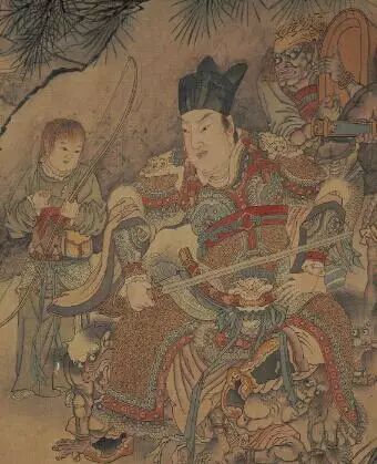 光有法宝还不算,二郎神还有一套“班底”,他身边有梅山六圣辅佐,梅山六圣据说是二郎斩杀蛟龙时前来帮忙的六位勇士,其名讳分别为:康安裕、张伯时、李焕章、姚公麟、郭申、直健。在二郎神麾下,还有一千二百草头神,是杨戬的私人武装,驻扎在灌口。草头神以弓弩、投枪、绳索等为兵器,作战时还有鹰、犬相助,在攻打花果山时,杨戬曾以一千二百草头神击败孙悟空的四万八千猴子,焕发出强悍的战斗力。在一幅现藏于美国大都会博物馆的明人绘本《搜山图》中,二郎神带领手下部卒在山间狩猎,捕捉妖怪,这里的二郎神金盔金甲,仗剑而坐,手下部卒擒住猴精、牛精、鸟精等精怪,故事的场景似是取自元杂剧《二郎神醉射锁魔镜》等本子,吴承恩曾见到这幅长卷,并作《二郎搜山图歌》,写到了捉妖的震撼场面:“江翻海搅走六丁,纷纷水怪无留纵。青锋一下断狂虺,金鏁交缠擒毒龙。”在这里,二郎神搜山擒妖,又被引申为猎神。吴承恩从这幅长卷中受到启发,成为他创作《西游记》的精神来源之一。