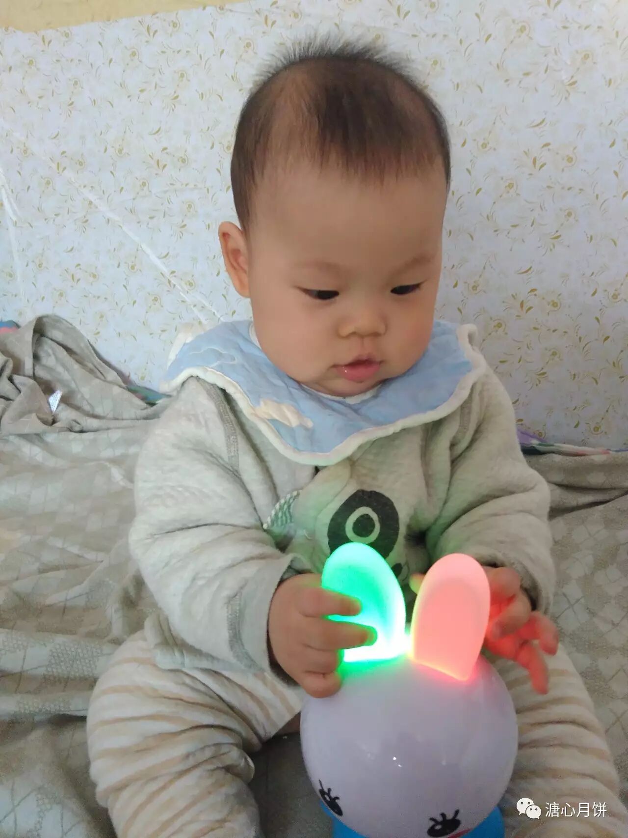 出牙:长牙的时候口水多,喜欢咬东西,拿咬咬胶辅助他。