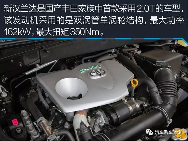 动力方面,新款汉兰达搭载2.0T和3.5L两款发动机,二者的最大输出功率分别为162kW和201kW,传动系统则匹配6速手自一体变速箱,部分车型还配备四驱系统。