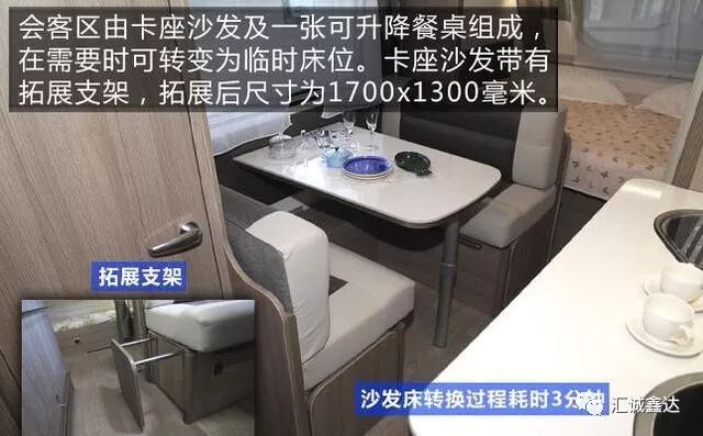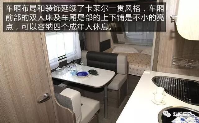 车厢布局和装饰延续了卡莱尔一贯风格,车厢前部的双人床及车尾部的上下铺是不小的亮点,可以容纳四个成年人休息。