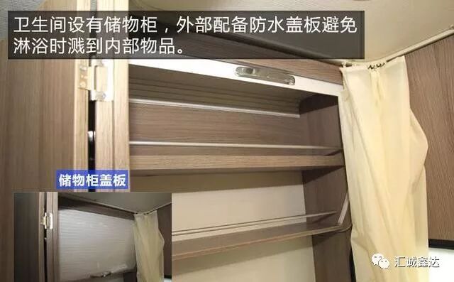 卫生间设有储物柜,外部配备防水盖板避免淋浴时溅到内部物品。
