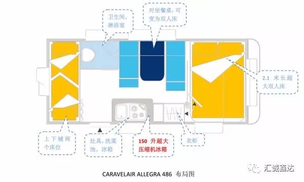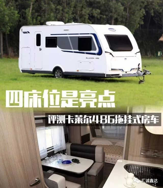 没错,就是这款今天要为大家介绍的卡莱尔486拖挂式房车,它拥有较大尺寸的车身,其内部空间也是十分宽裕。车头的双人床加上车尾的上下铺,能够同时容纳四个成年人休息;如果再把车厢中部的卡座沙发转换成床位,那么容纳六人出行休息也不成问题。让我们一块来看看它的整体表现吧!