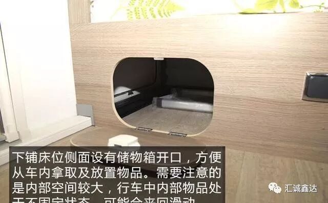 下铺床位侧面设有储物箱开口,方便从车内拿取及放置物品。需要注意的是,内部空间较大,行车中内部物品处于不固定状态,可能会来回滑动。
