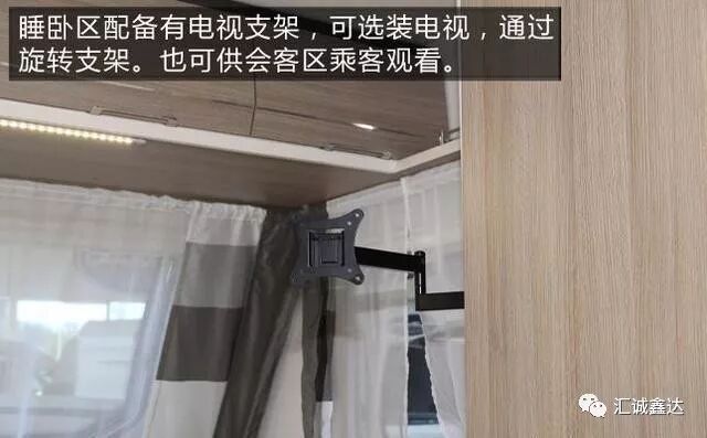 睡卧区配有电视支架,可选装电视,通过旋转支架,也可供会客区乘客观看。