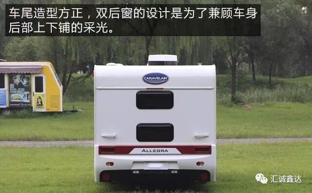 车尾造型方正,双后窗的设计是为了兼顾车身后部上下铺的采光。