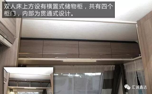 双人床上方设有横置式储物柜,共有四个柜门,内部为贯通式设计。