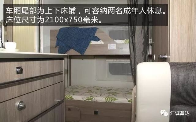 车厢尾部为上下床铺,可容纳两名成年人休息。床位尺寸为2100*750(mm)。