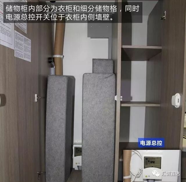 储物柜内部分为衣柜和细分储物格,同时,电源总控开关位于衣柜内侧墙壁。