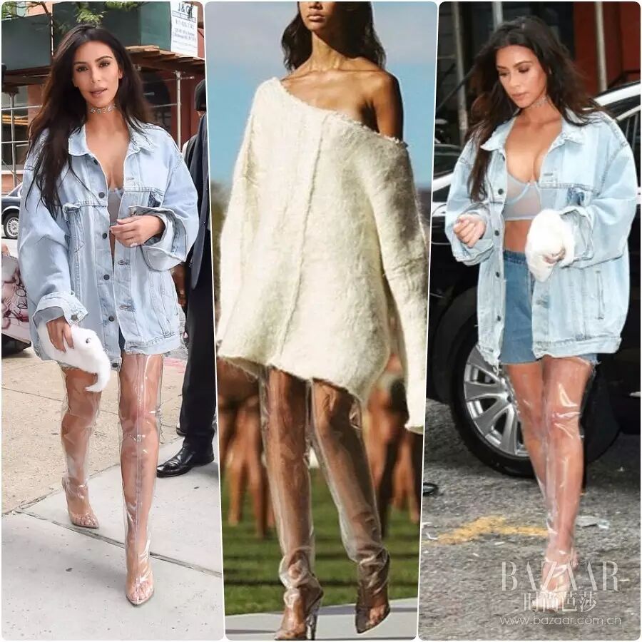 以及9月7号 Yeezy Season 4 的秀刚刚结束,Kim Kardashian 早在前一天就穿了这双全新的Season 4 透明高跟长靴,希望脚出汗不会有雾气。