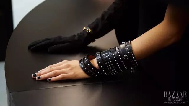 钯金饰钉装饰的全新黑色绒面小牛皮全刺绣大衣,搭配黑色高科技丝织及绒面小牛皮钯金饰钉全刺绣衬衫式背心,配以同样材质的高腰百慕大短裤,散发出率性的熠熠光彩。