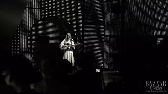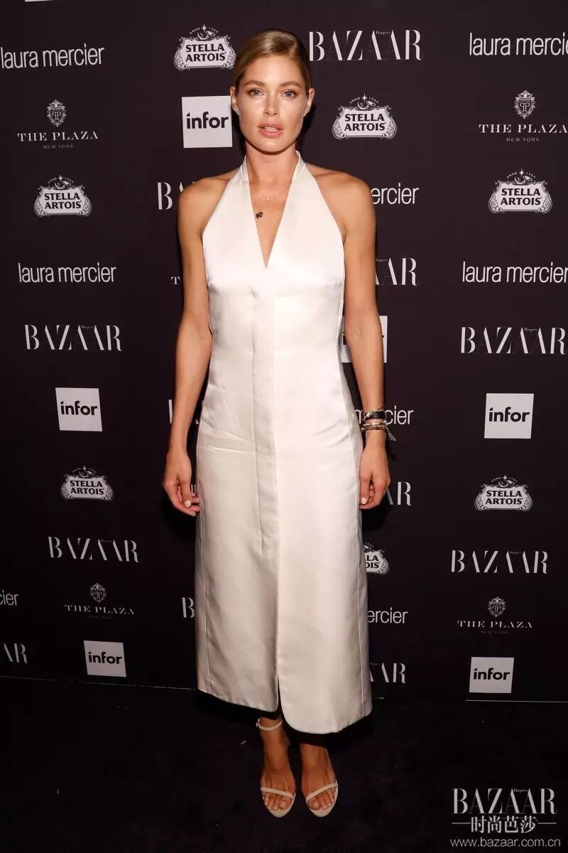 Doutzen Kroes的白色长裙则显得清爽干净,在黑色的背板前面衬得她光彩照人。